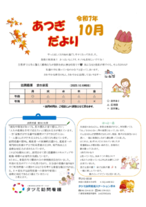 タツミ訪問看護~人生をあたためるステーション~ お問い合わせホーム私たちの使命サービス案内訪問看護ステーション紹介会社案内採用案内お知らせお問い合わせ 採用サイトへ newsお知らせ ホーム > お知らせ > ステーション通信 > あつぎだより 10月号2025.10.15あつぎだより 10月号やっと涼しくなり始め過ごしやすくなってきました。食欲の秋到来!さつまいもにクリ、キノコも美味しいですね!自然界では冬に備えて動物たちが食材を沢山摂る時期です🐻秋になると食欲が増すのも、そんなDNAが私達の中に残っているのかな?と思ってしまいます。さわやかな秋空のもと、さわやかに訪問してまいります~ 🌼今月のあつぎだよりはこちら🌼 1 / 1 一覧に戻る 次へ進む »